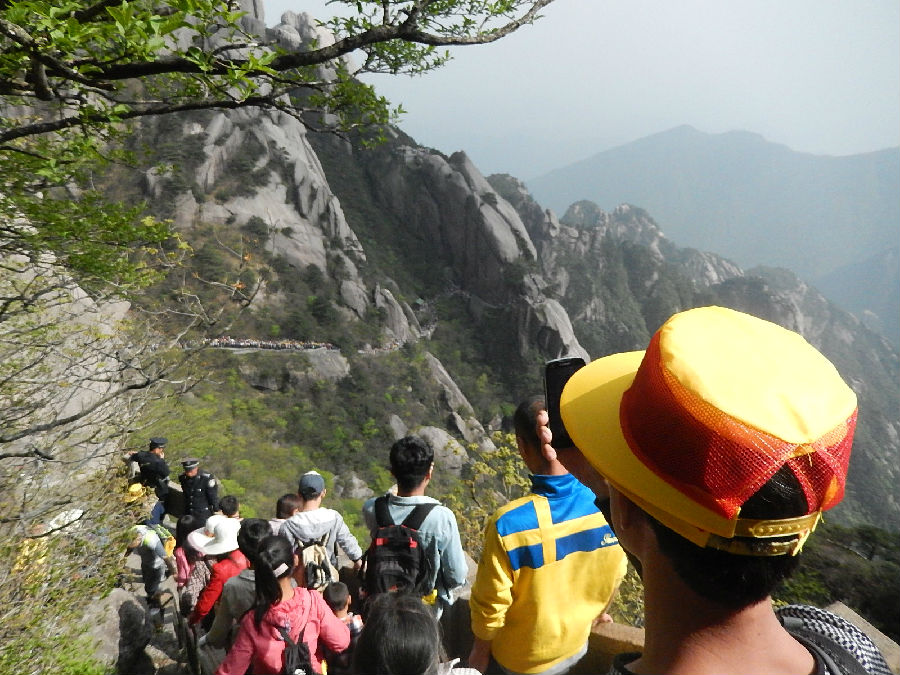 看過上圖,不知幾個人還能睡得好,雖然白天爬山太累??本人也本著之前去過一次黃山,認為黃山的風(fēng)景還是很秀麗的,所以在今年5.1又帶家人去了一次,由于過節(jié)太擠了,索道太難等了,全家都是從云谷索道爬上去的,因為我去過一次,所以就由我?guī)ьI(lǐng)家人從以前走過的線路走的.本以為這次也帶家人看一看黃山在書中所寫的半山寺外抬頭見,展翅金雞叫道衢;登上龍蟠回首睹,扶肩五老上天都的風(fēng)景,可惜月份去得太早了點,樹也才發(fā)芽,葉子都還沒有長出來,最難受的那就是人太多,一路是走走停停,不遠的路都要走比平時多幾倍的時間.
